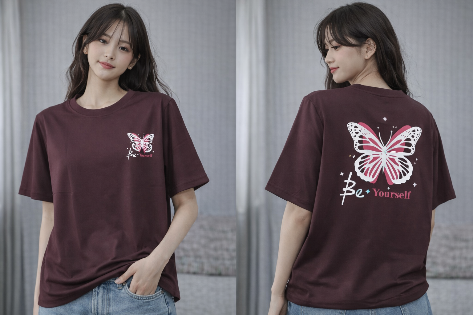 Trendy Korean style printed T-shirt for women featuring a stylish butterfly graphic design. Made from soft breathable cotton fabric, this casual oversized T-shirt is perfect for daily wear, college fashion, and retail stores.