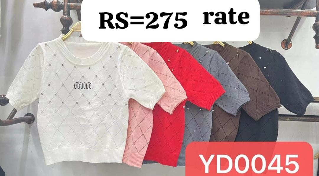 Korean Diamond Knit Pearl Embellished Short Sleeve Top.- ZF-23