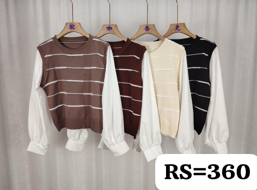 Korean Striped Knit Vest Layered Blouse - Long Sleeve s- ZF-12